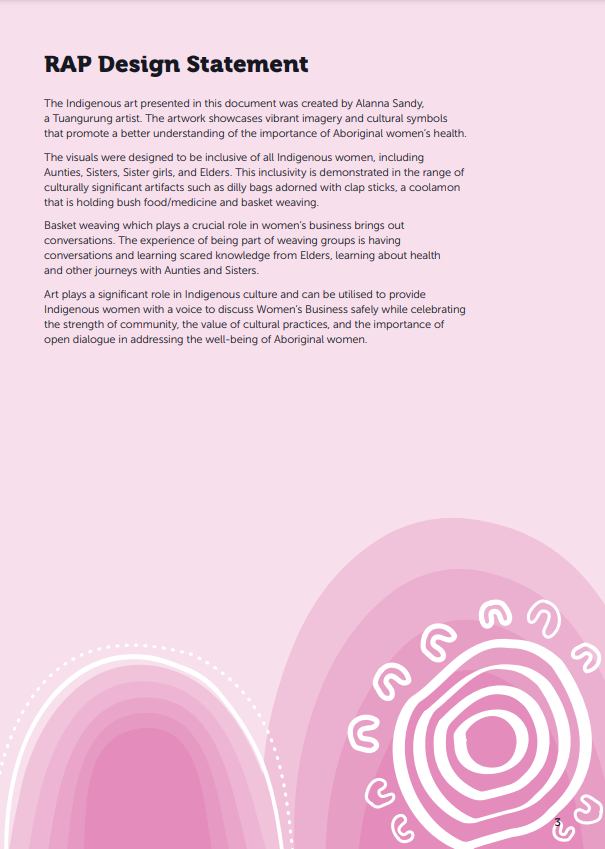 I had the opportunity to create artwork for Women's Health East's RAP. The artwork showcases vibrant imagery and cultural symbols that promote a better understanding of the importance of Aboriginal women's health.